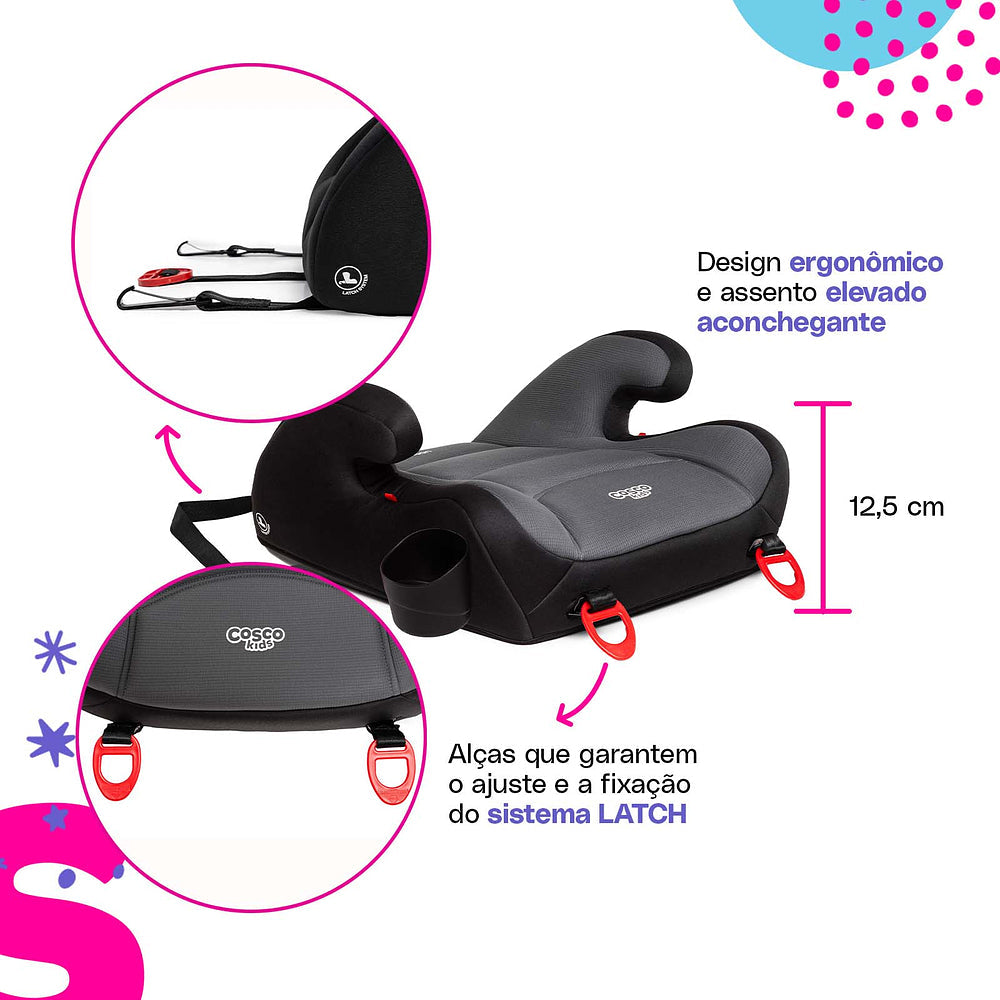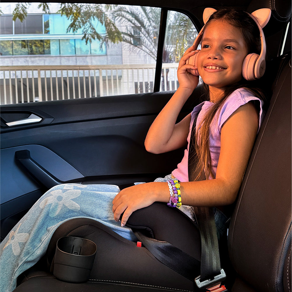 O Booster ainda vem com porta-copos embutido, que mantém a bebida acessível para a criança sem que os responsáveis precisem esticar o braço no meio do caminho. Compacto e leve, também é fácil de trocar de carro quando precisar. Praticidade e segurança pra todo mundo ir mais longe, junto!