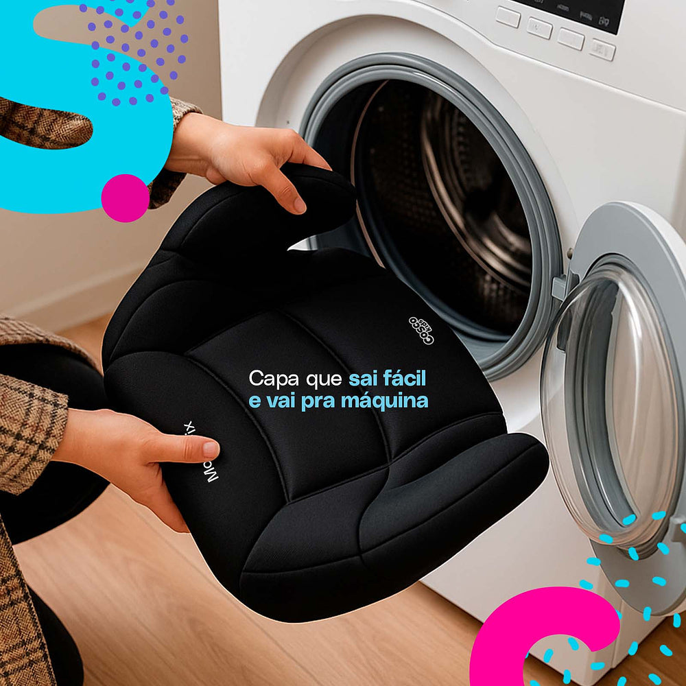 O assento tem formato ergonômico, que ajuda a manter a postura correta da criança e deixá-la confortável até mesmo em viagens longas. A capa é removível e lavável na máquina, ideal para a rotina agitada das famílias em que suquinho derramado e migalha no banco fazem parte do pacote.