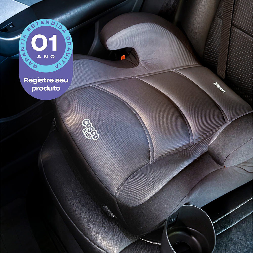 O Booster Moon é um assento de elevação para crianças de 15 a 36 kg, com instalação por sistema LATCH — tipo de fixação que conecta o assento direto no banco em carro com entrada Isofix, evitando que ele escorregue ou se mova em curvas e freadas — gerando mais estabilidade e mais segurança em todos os trajetos.