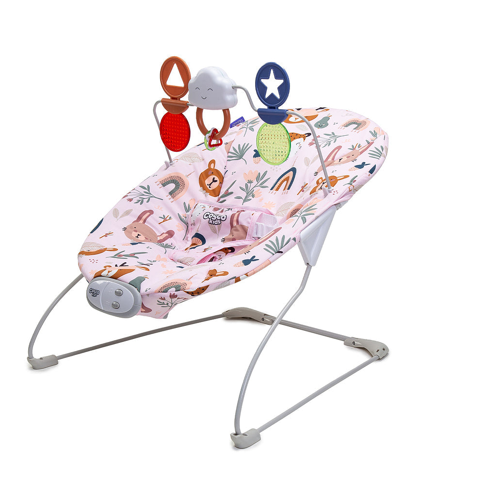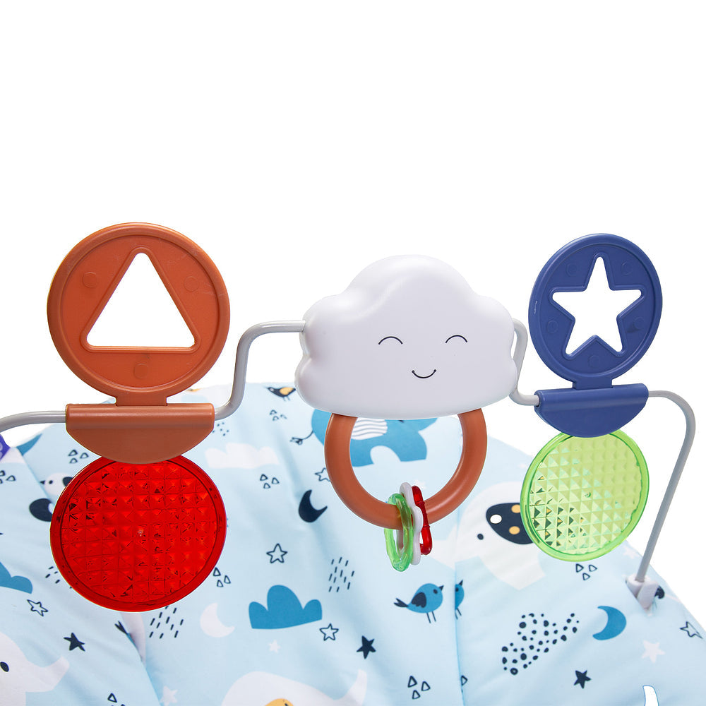 Ele conta com as funções de música e vibração: as duas funções podem ser reguladas para se adaptar à preferência e à fase do seu bebê. Prática, a barra com brinquedos interativos é removível e pode ir junto nos passeios pra entreter o pequeno.