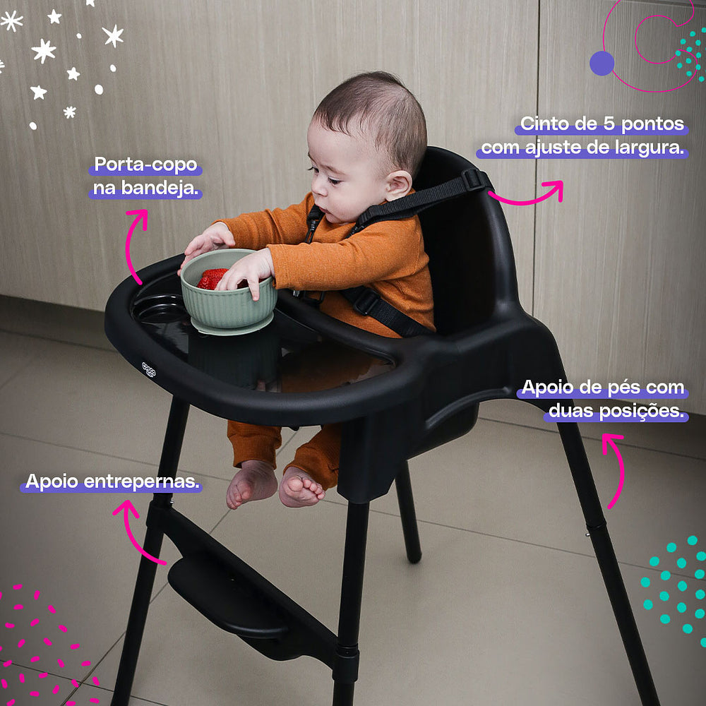 A Cook acompanha a criança desde a introdução alimentar até quando já está comendo sozinha. Ela ajuda o pequeno a ficar pertinho da mesa e do restante da família, contribuindo para o seu desenvolvimento. E olha só: a bandeja ainda pode ser guardada com facilidade na parte de trás!