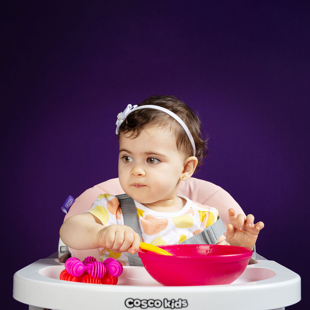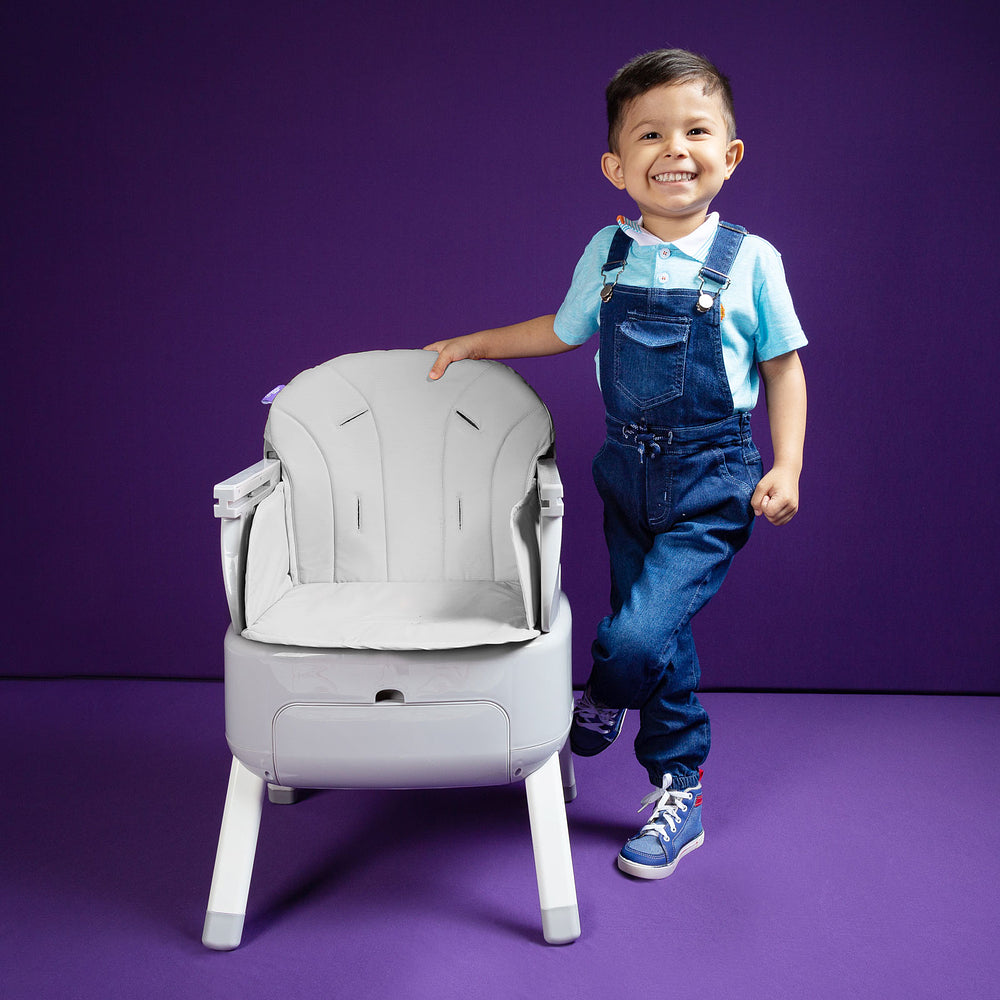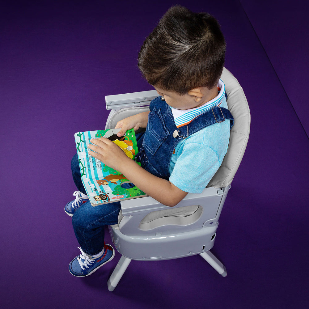 Além das diferentes maneiras de usar, ela também acompanha o crescimento do pequeno: a bandeja pode ser ajustada em 3 posições de distância, o cinto de segurança de 5 pontos tem ajuste de largura e a tira que fica entre as pernas da criança tem 2 posições. Pra uma posição bem confortável, o apoio dobrável de pés pode ser aberto na hora da refeição e depois, ficar fechadinho.