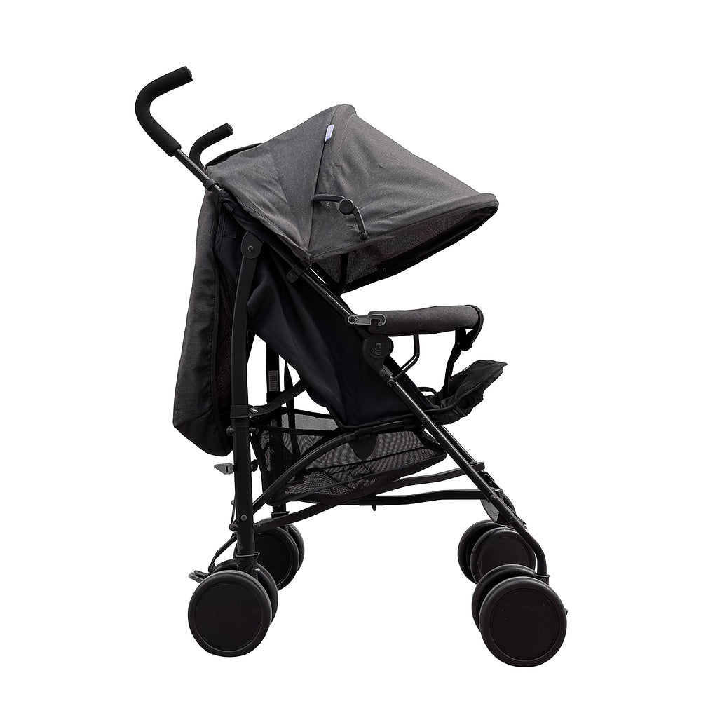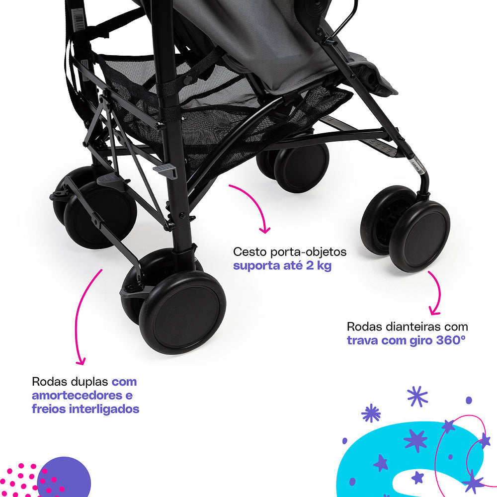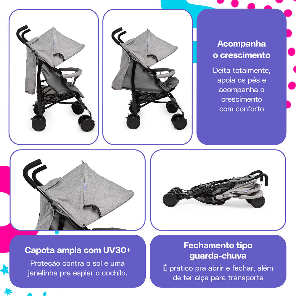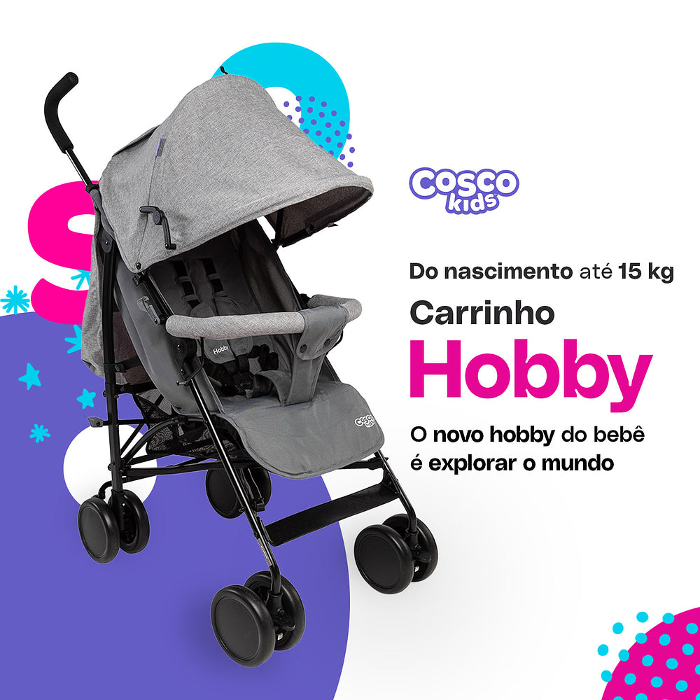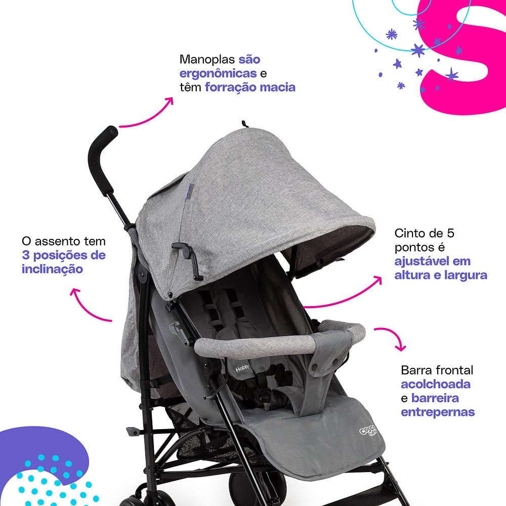 Um carrinho que seja prático, fácil de usar e te acompanhe em todos os momentos com o bebê é sem dúvida o Hobby da Cosco. A inclinação total do assento junto com o apoio dos pés elevado traz conforto e segurança para uso desde o nascimento. Ajusta-se em 3 posições de inclinação e do apoio dos pés, conforme o bebê aprender a sentar e for crescendo. Oferece uma superproteção com a capota que pode ser ampliada até dobrar de tamanho, com proteção UV30+, visor para acompanhar o bebê e bolso para objetos menores que precisem ficar sempre à mão para os pais. A barra frontal é macia e forrada, trazendo conforto e um apoio para a criança com barreira extra entrepernas. Manoplas ergonômicas para conduzir e 4 rodas duplas, com visual moderno, dão mais estabilidade nos passeios além dos freios interligados no acionamento - basta pressionar um dos lados. Sempre pensando em segurança, inclui cintos de 5 pontos, com protetores acolchoados e ajustáveis em altura e largura.
