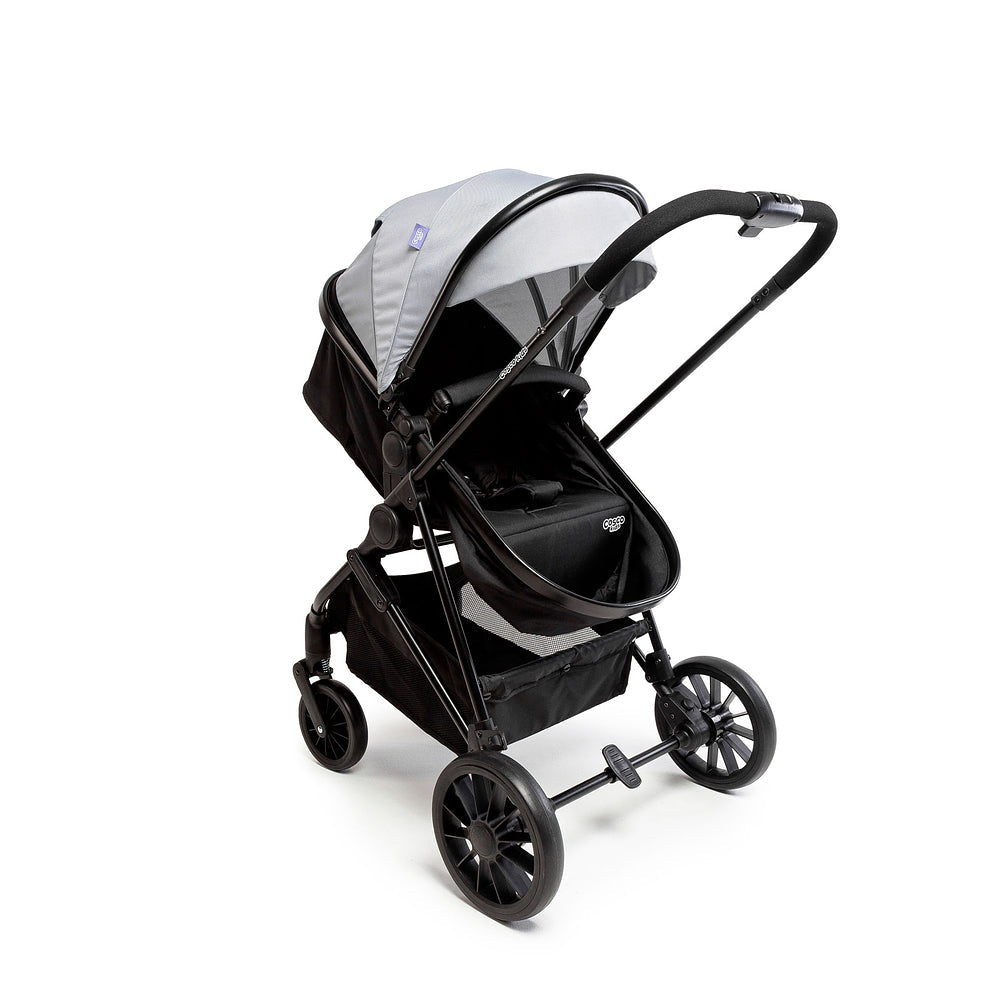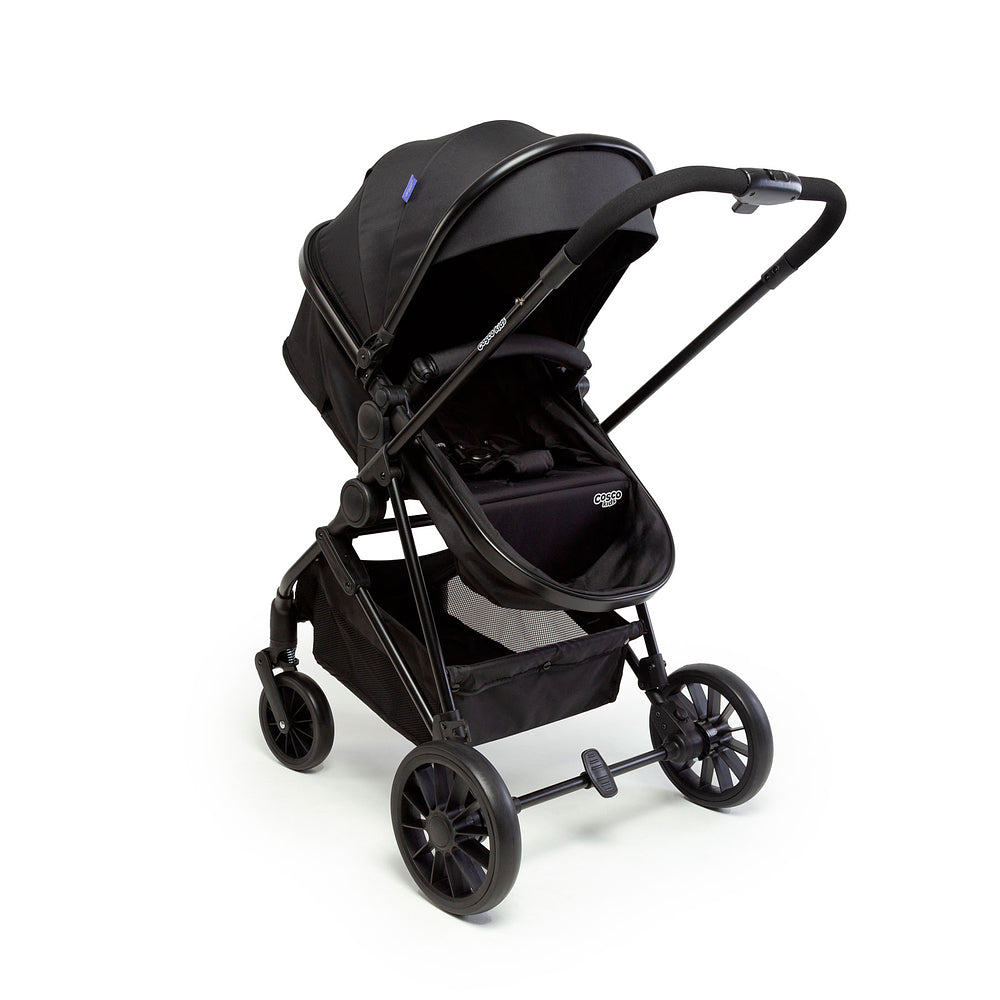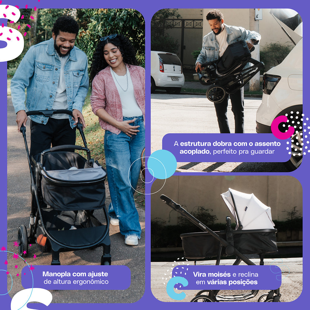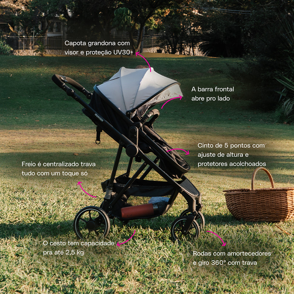 E quando ele começa a crescer, é só ajustar pro modo passeio, tudo com conforto de sobra e jeitinho prático que encaixa na rotina das famílias. A estrutura é robusta, as rodas têm amortecedores para andar em terrenos irregulares, e a manopla se ajusta na altura de quem estiver empurrando (pode ser a mamãe, o papai ou até a vovó!).
