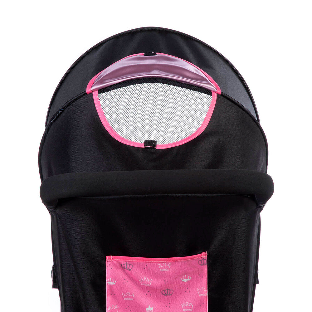 A capota é ampla, com proteção UV30+ e pode ser estendida para aumentar o conforto do bebê nos dias ensolarados, além de ter visor e bolso extra para pequenos objetos. A bandeja possui porta-copos e um compartimento para livrinho ou celular, para divertir e distrair o bebê.