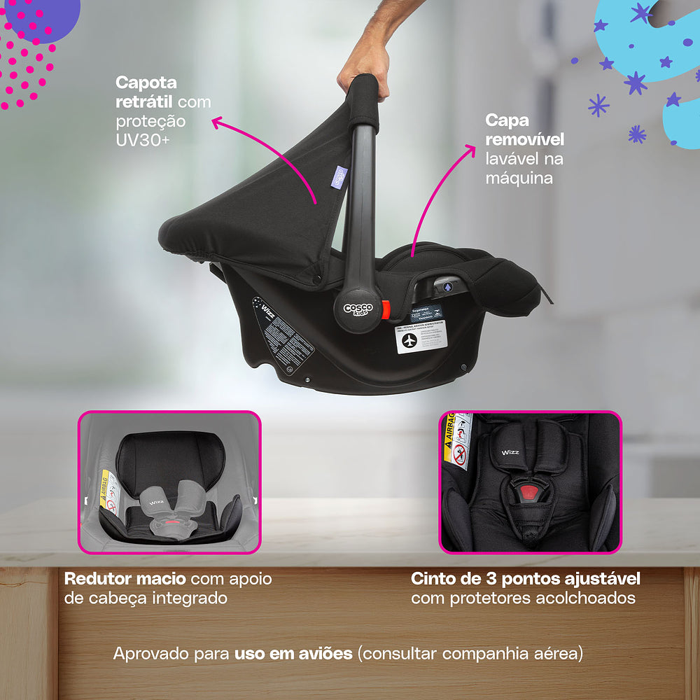 Bebê conforto Wizz com estrutura resistente, 5 modos de uso: transporte, balanço, fixo, instalação no carro e no carrinho. Capota retrátil com proteção UV30+. Capa que pode ser lavada na máquina e cinto de segurança de 3 pontos com protetores acolchoados. Compatível com a base Wizz (não inclusa).