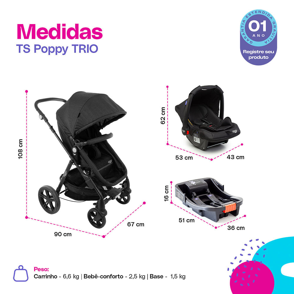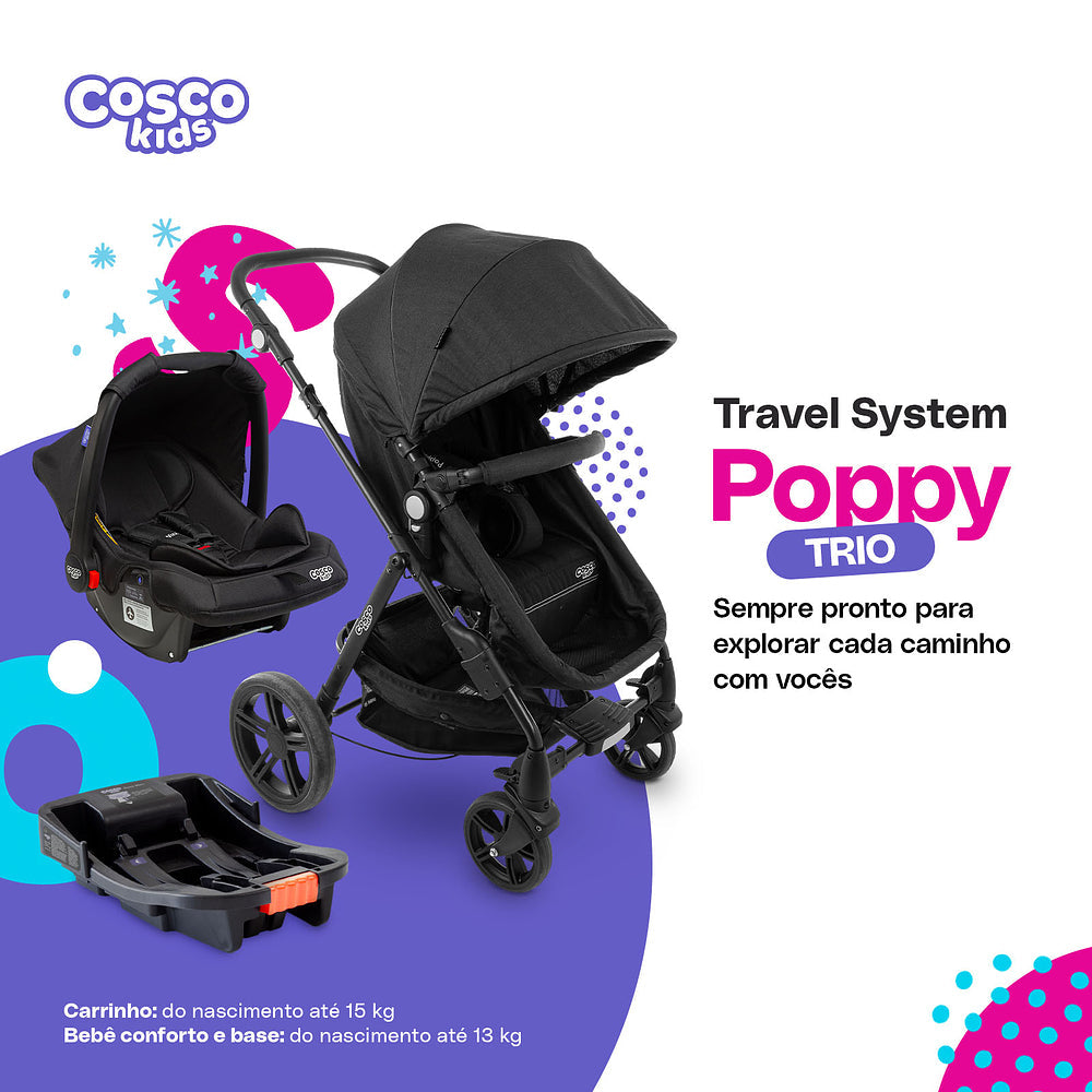 O conjunto Travel System Poppy 3.0 Trio é solução perfeita para o dia a dia de uma família com um bebê!